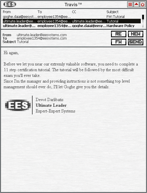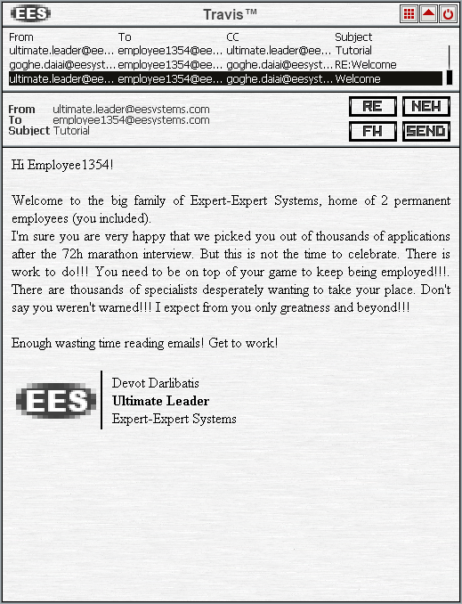 There is also a boss roaming around. One, and it's one too many. He's powerful and horrible, but only where it counts, on the inside. He's not the kind of boss which waits for you patiently in a dark cave or in a misty swamp with a big axe and the straightforward desire to do life-threatening surgery on you. Like most real life bosses, he enjoys overly bright offices and caffeine, crushing the souls of his employees, majorly disrupting the work of everyone and, on the outside, looking like a normal human being. But don't let yourself fooled by this! You'll need to fight him constantly!